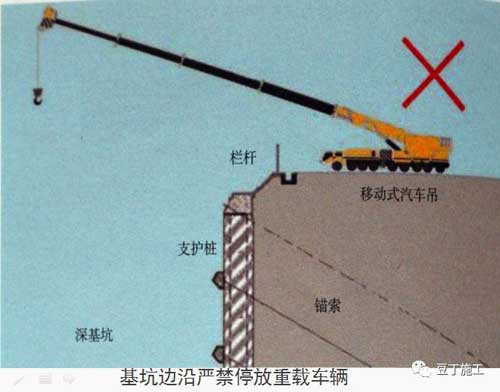 检点要点:基坑边堆置土、料具等荷载应在基坑支护设计允许范围内。